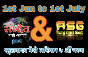 30 April, 2019 राजेन्द्र लिम्बु यु.ए.ई। नौलो अभियान को नौलो प्रयोग स्तर उन्नतिको लागि हाम्रो सहयोग भन्ने उद्देश्यका साथ स्थापित स्मुल गायन मैत्री अभियानको यो सातौँ प्रबेश गरिरहेको छ। अबको छैठौँ चरणमा इन्टरनेसनल स्मुल सिङ्गिङ ग्रुप (ISSG) र काठमाडौं सिङ्गिङ ग्रुप (KSG ) बीच 1st may बाट 1st june सम्म हुने स्मुल गायन मैत्री अभियानको अफिसियलले जनाएको छ ।