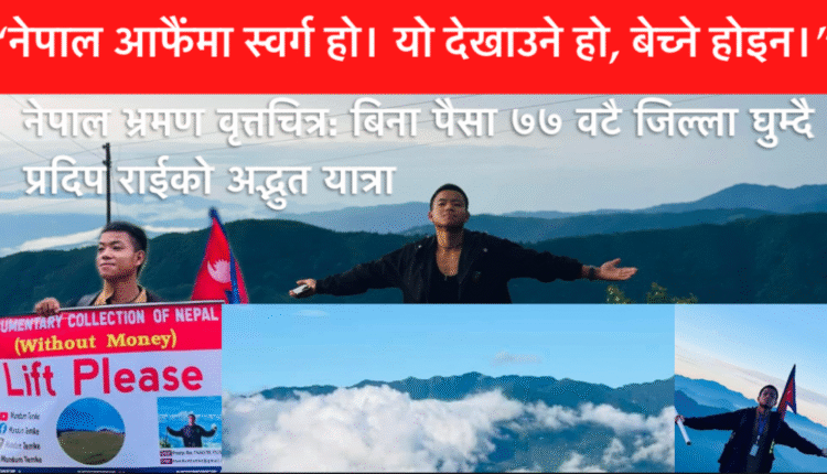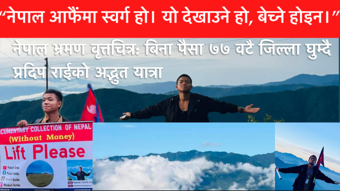 नेपालको पर्यटन प्रवर्द्धनको अभियानलाई नयाँ उचाइमा पु-याउँदै, भोजपुरका एक १९ वर्षीय युवाले यस्तो साहसिक यात्रा थालेका छन्, जुन कल्पना गर्न पनि मुस्किल पर्छ। कुनै आर्थिक सहयोग बिना, खाली हात सबै ७७ जिल्लाको यात्रा गर्दै, नेपाललाई विश्व सामु चिनाउने कार्यमा लागेका छन् — उनी हुन् प्रदीप राई।